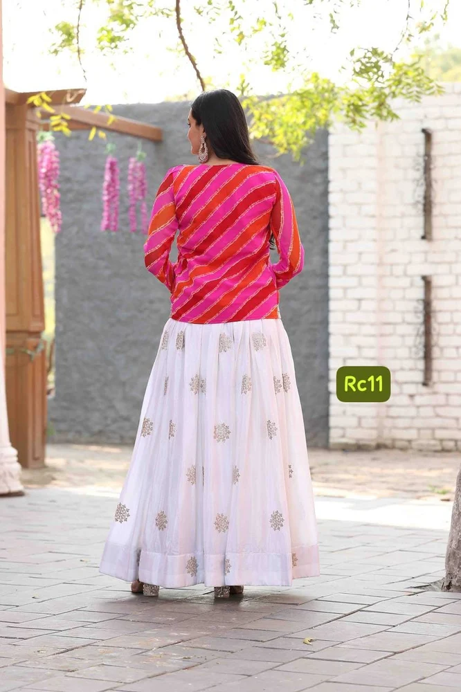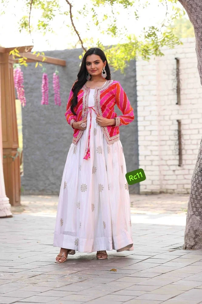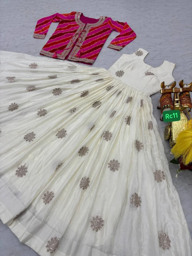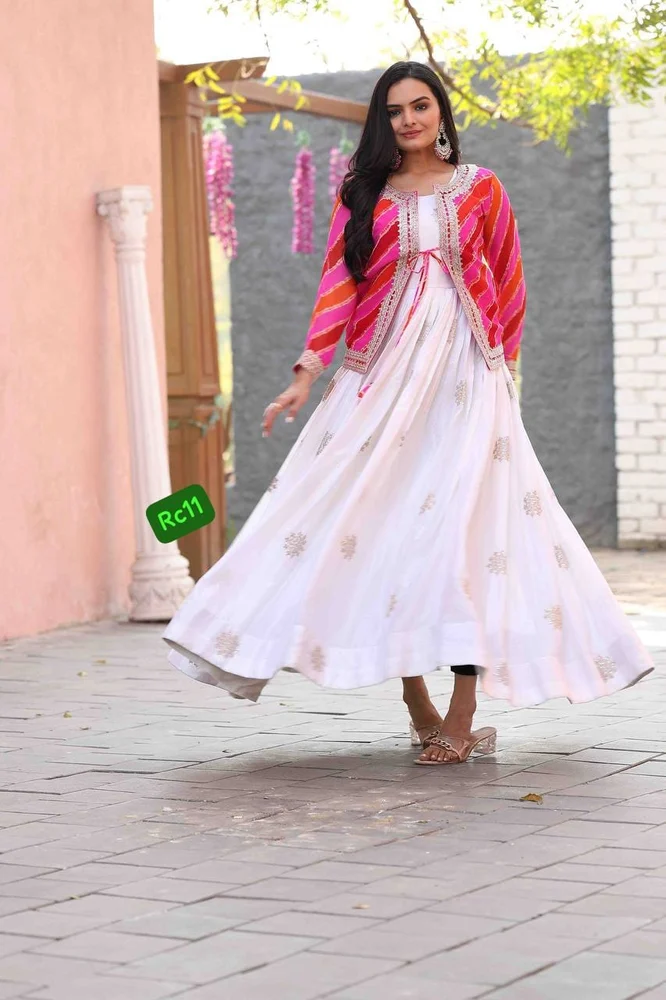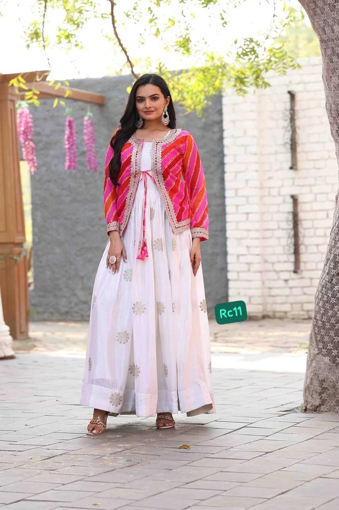 New Festival Leheriya Jecket & Long Gown Cdk GownFabric:- pure chinonWork :-cording 3mm sequence Embroidery workInner:- Micro CottonSize:- M upto L margin XL upto 2xl margin (Fully Stitched) Jecket Fabric:- Pure leheriyaInner:- Micro CottonWork:- cording 3mm sequence Embroidery workSize:- M upto L margin XL upto 2xl margin