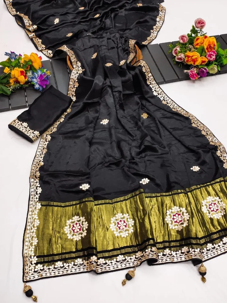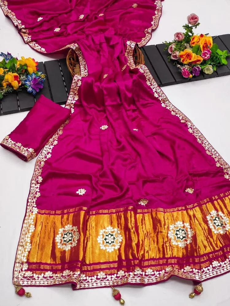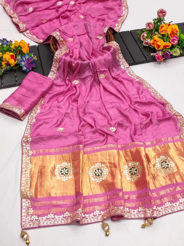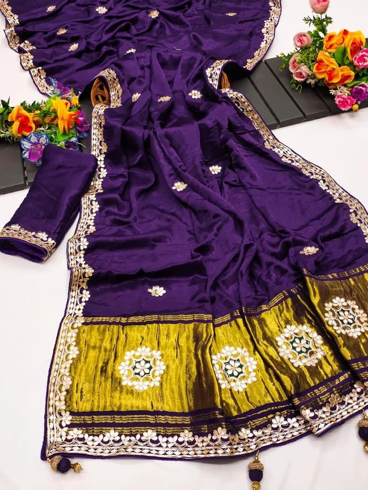 This saree features Original Lagadi Patta Gala Pallu with complete Hand Gota Patti Work, giving it a royal and authentic ethnic look. The intricate hand detailing enhances its festive and wedding appeal.