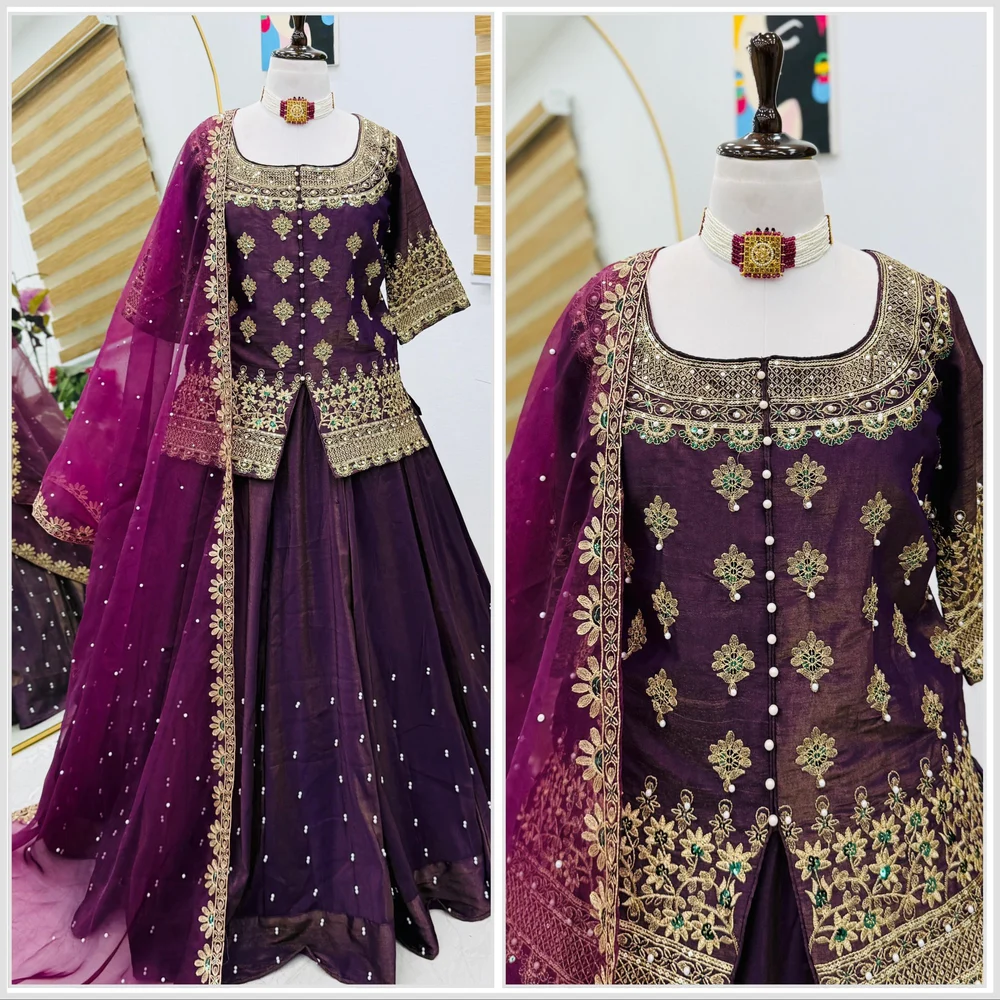 Designed with rich embroidery detailing, this elegant semi-stitched outfit gives a royal and graceful look. The flowy georgette fabric enhances the overall fall and adds a luxurious touch, making it perfect for wedding celebrations and festive functions.