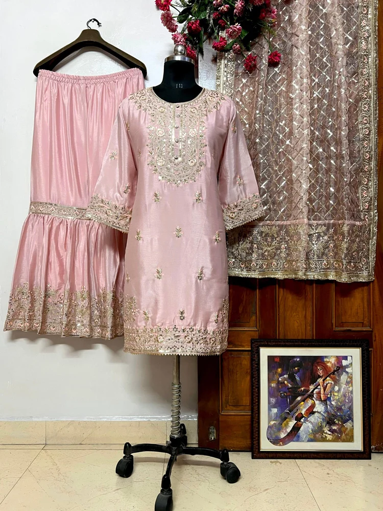 👉SHARARA:-🔸 Fabric: beautiful CHINON SILK🔸Inner: micro 🔸Work : 5mm sequins and zari Embroidery work 🔸Size & Length: fully stitched to xxl size (free size) & SHARARA length is 40-41 inch