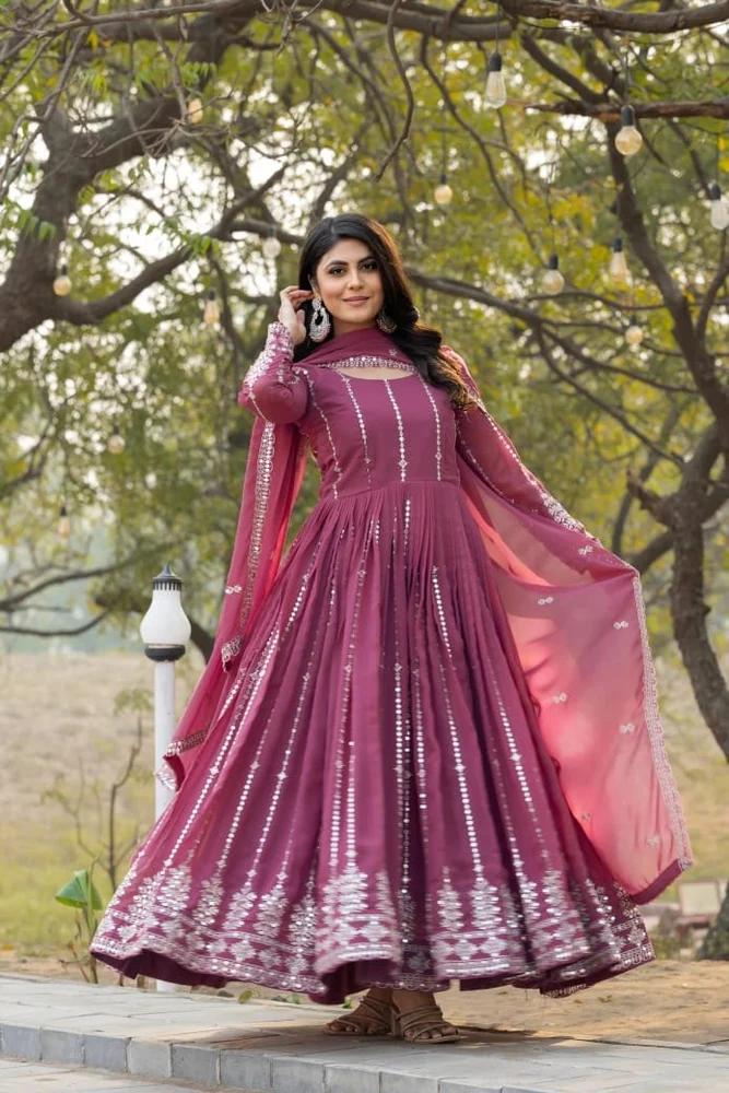 GownFabric:- Fox GeorgetteWork:- Heavy 7mm sequence Embroidery WorkInner:- Micro CottonFlair:-3.50 mtrSize:- M upto L margin            XL upto 2xl margin              (Fully Stitched)       DupttaFabric:- Fox GeorgetteWork:- Heavy 7mm sequence Embroidery WorkSize:- 2.30 Meter