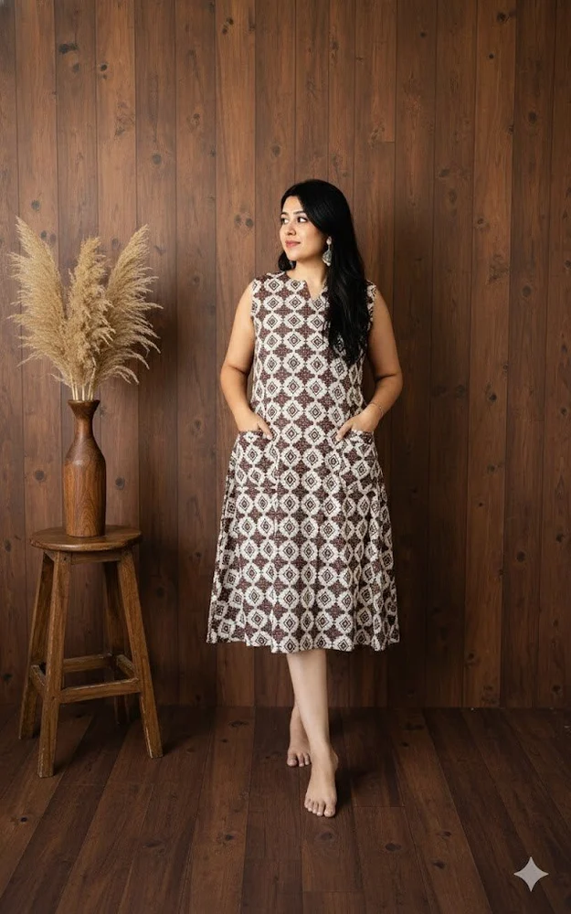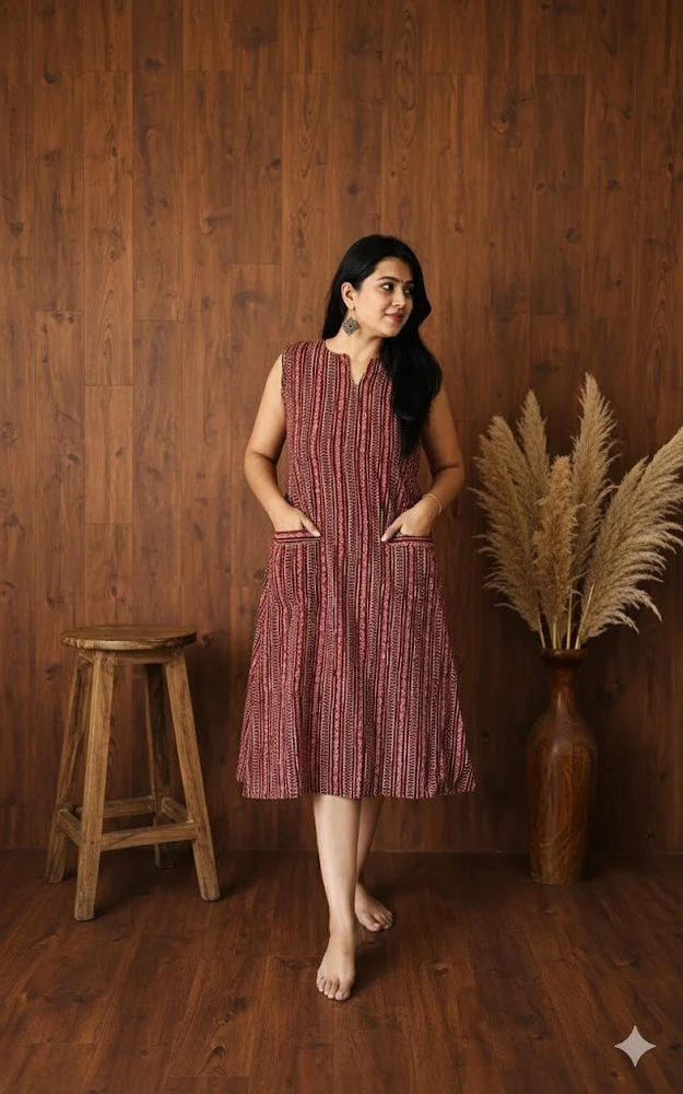 Add a touch of traditional elegance to your wardrobe with this beautiful Ajrakh Hand Block Print A-Line Kurti. Designed for comfort and style, this sleeveless kurti is perfect for casual outings, office wear, and light festive occasions.