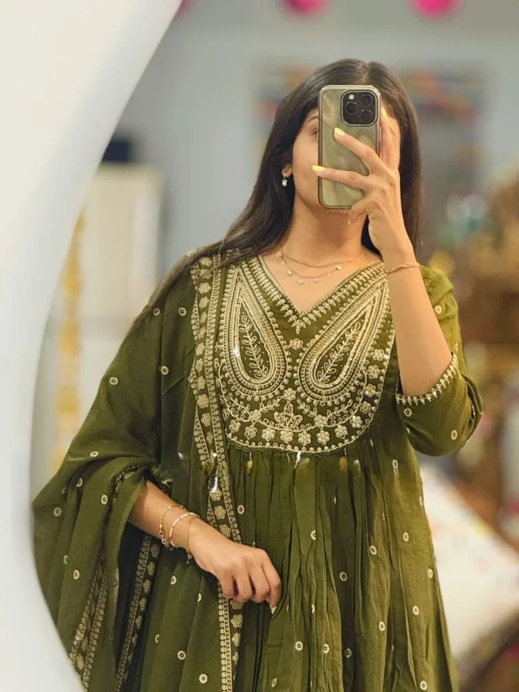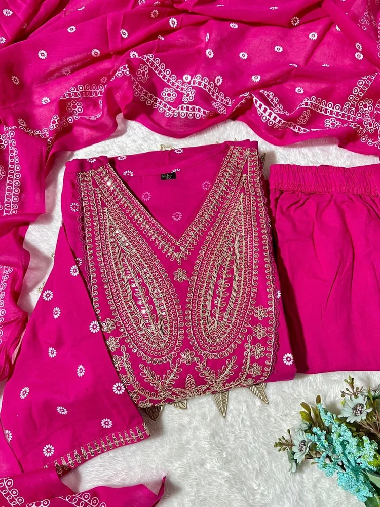 Designed for comfort, elegance, and festive charm.This stylish set features a vibrant kurti with elegant embroidery detailing on the yoke and a flattering pleated design. Paired with matching pants and a soft malmal dupatta, it’s perfect for festive celebrations, family gatherings, and even classy casual wear.
